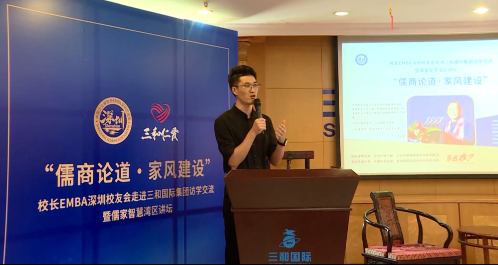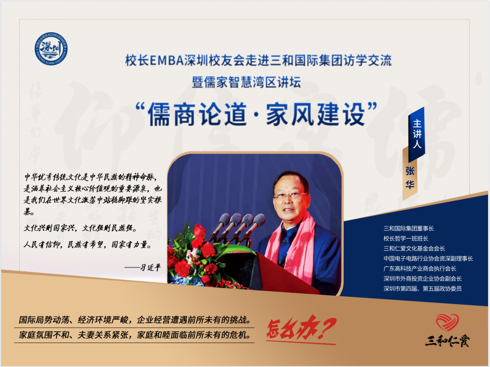 三和国际集团近40年来,在企业经营的大潮中勇往直前,将中国传统文化精髓和现代商业先进理论融合,延申发展出三和所独有的儒商文化。张华会长重点分享了《儒商使命》、《儒商标准》和《儒商智慧》,给到企业面对挑战的心得分享。