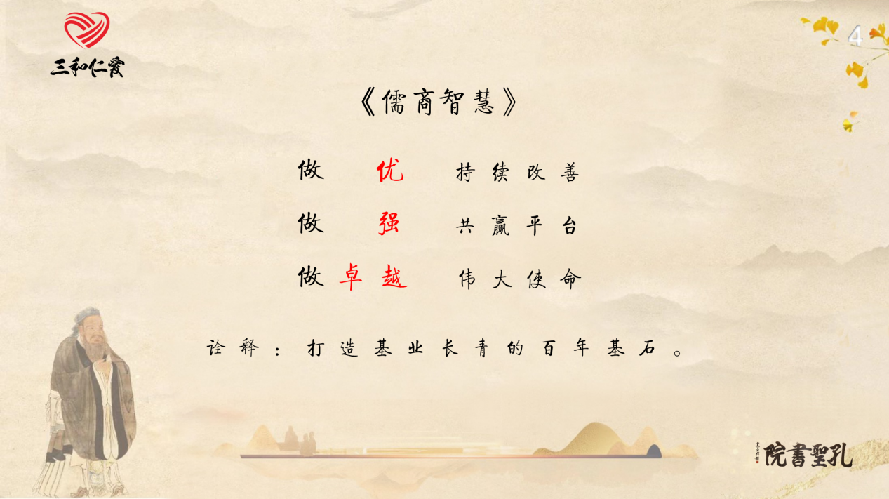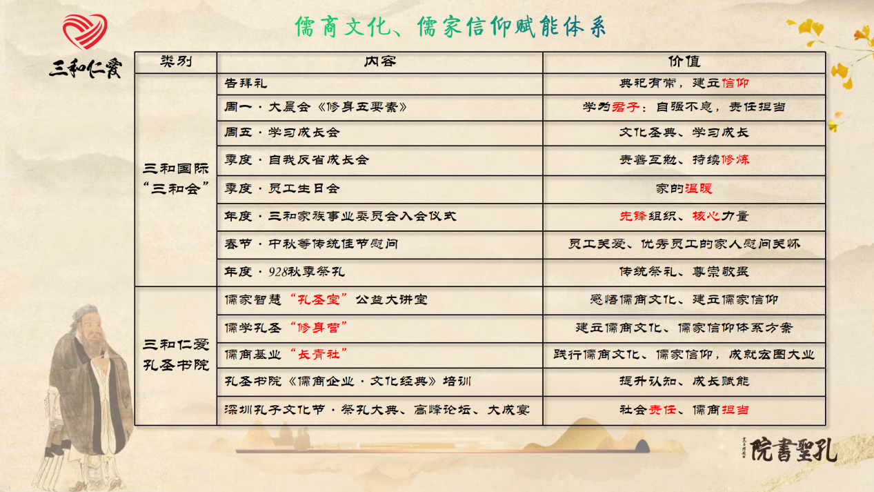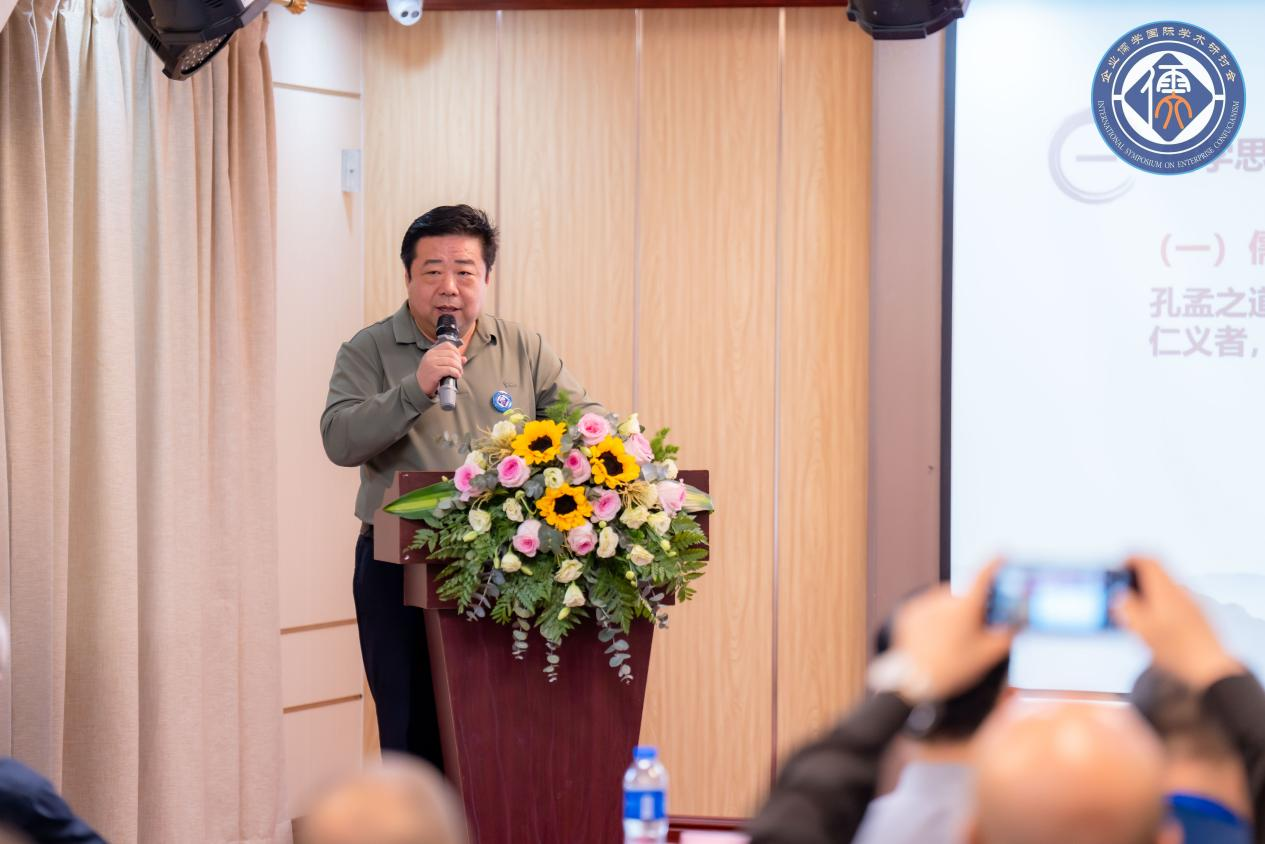 本次学术研讨会主旨为推动“中国现代化”背景下企业儒学的发展,探索中国式现代化企业治理的新模式,为当代世界新工商文明的构建贡献中国的方案,大会主题为“企业儒学的开创与传承”,三和国际集团董事长、三和仁爱文化基金会会长张华先生作为儒商企业代表应邀出席大会,并结合三和国际集团38年来企业经营实践和儒商文化探索、儒家信仰体系建立,系统化梳理了三和的儒商模式,以《儒商文化、儒家信仰体系的赋能平台》为题作主旨发言。
