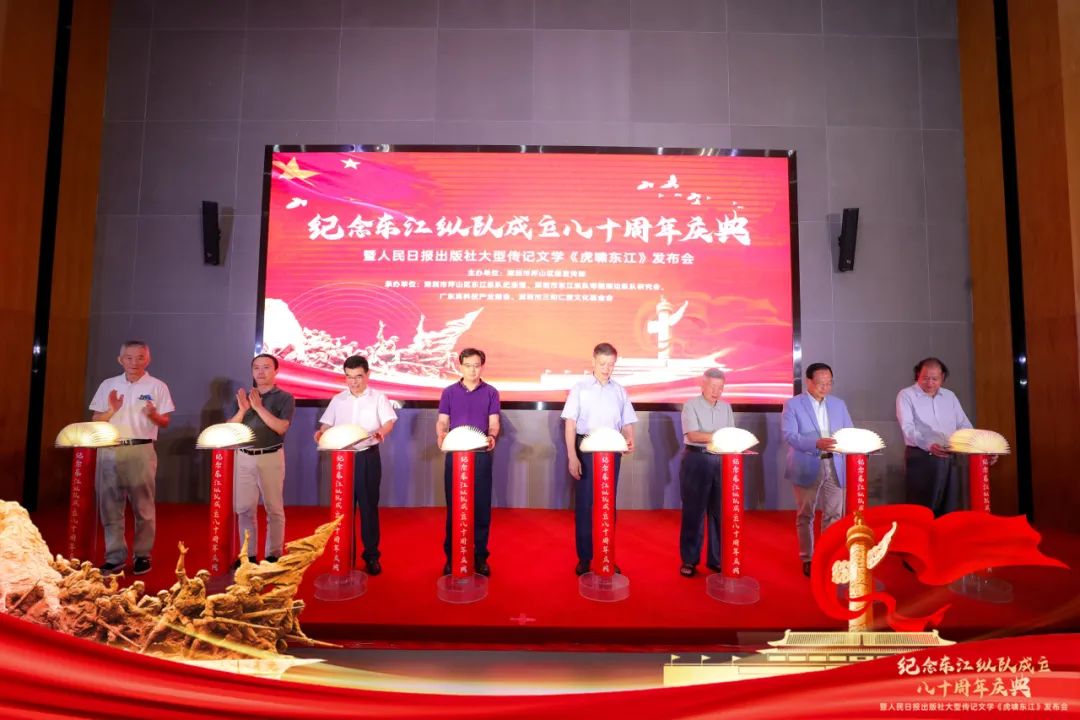 由深圳市原政协主席戴北方,深圳市坪山区委常委、宣传部部长邓艳东,深圳市委宣传部宣传处处长熊健撰,三虎队老战士、深圳市原粤赣湘边纵队战友联谊会会长何鹏飞,《虎啸东江》作者吴重龙,全国政协委员、深圳市企业联合会、深圳市企业家协会常务会长、广东高科技产业商会会长王理宗,深圳市东江纵队粤赣湘边纵队研究会会长李建国,深圳孔子文化节创始人、三和仁爱文化基金会会长、东江纵队研究会名誉会长、三和国际集团董事长张华共同启动人民日报出版社大型传记文学《虎啸东江》新书发布仪式。