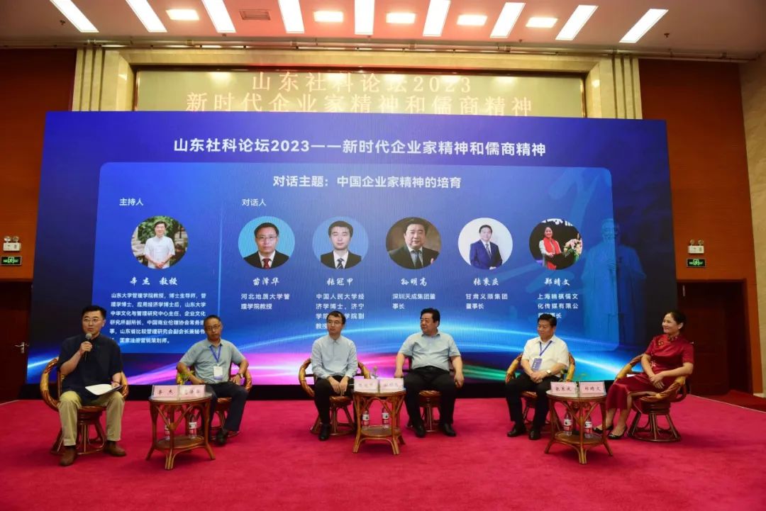 河北地质大学管理学院教授苗泽华、济宁学院儒商学院副教授张冠甲、深圳天成集团董事长孙明高、甘肃义顺集团董事长张秉庆、上海晴祺儒文化传播有限公司董事长郑晴文围绕“中国企业家精神的培育”在下午进行第二段大会对话。