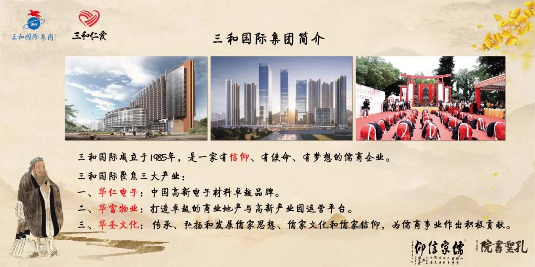 三和国际,自1985年深圳诞生起,便以儒家思想为信仰,致力于儒商事业的发展。旗下三大产业包括华仁电子、华富物业和华圣文化,分别在高新电子材料、商业地产与高新产业园运营以及儒家文化传承方面取得了卓著成就。三十九年来,三和国际始终坚守儒家文化的传承与弘扬,为儒商事业积极贡献力量。