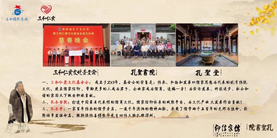 此外,三和国际还成立了三和仁爱文化基金会,旨在推广儒家思想。同时,孔圣书院与孔圣堂作为儒家文化的重要载体,也在推动文化产业发展和传承儒学方面发挥着重要作用。孔圣堂更是承载了儒学两千五百年的光辉与使命,经陈焕章发掘命名,最终在张华先生的努力下回归大陆,扎根深圳。