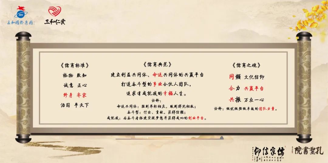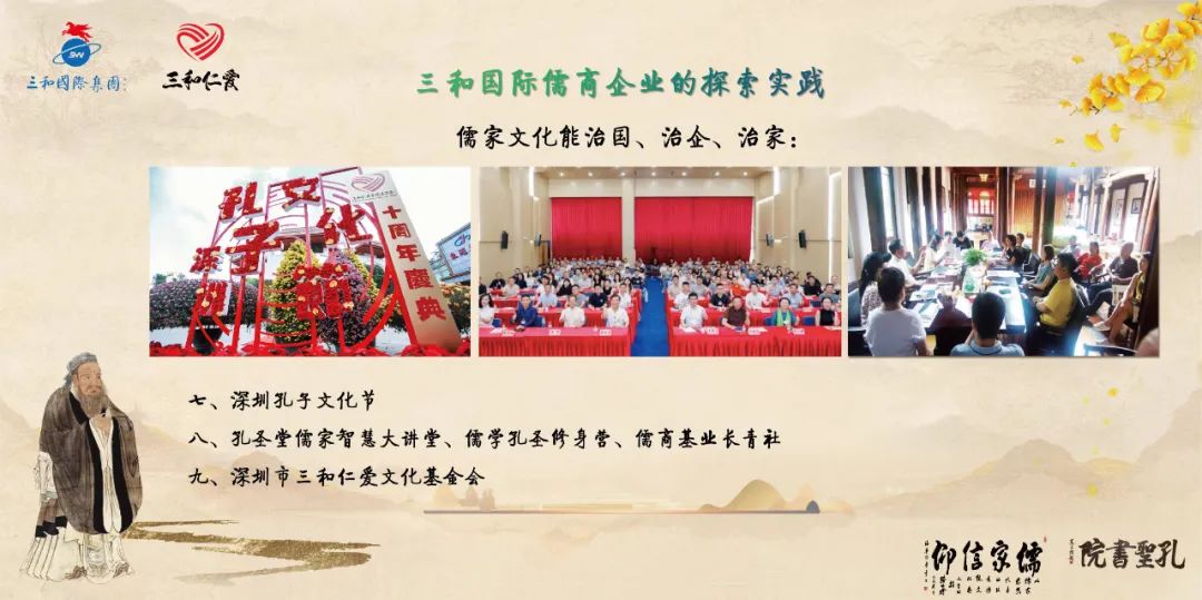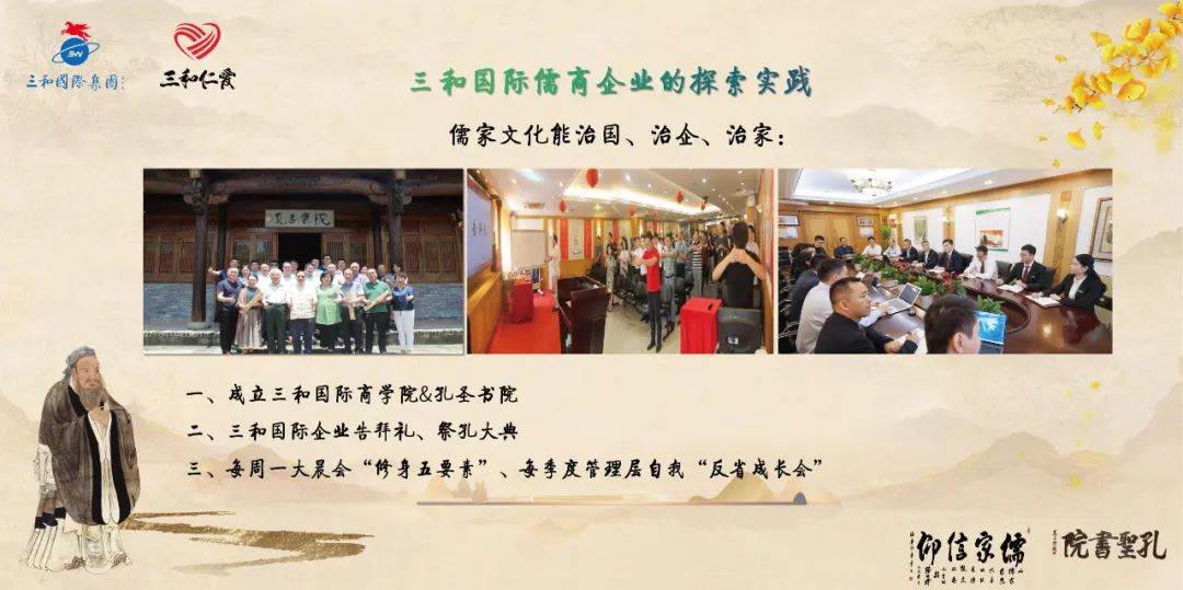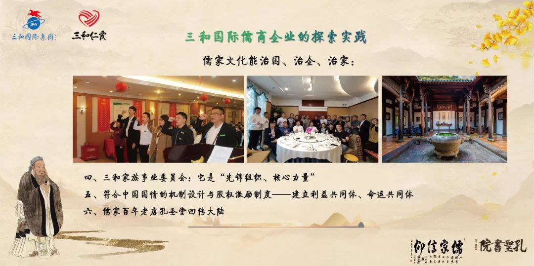 以上理念在三和国际儒商企业的实践中得到深刻验证,儒商文化不仅可治国、治企,更能治家。三和国际通过成立商学院与孔圣书院,深化儒家思想、圣贤文化的学习与应用;举行告拜礼与祭孔大典,传承儒家传统礼仪;每周大晨会强调修身五要素,每季度管理层自我反省成长会,持续提升个人与团队素质,转化生产力。同时,设立家族事业委员会作为企业的先锋组织核心力量,设计符合国情的机制与股权激励制度,构建利益与命运共同体。儒家百年老店孔圣堂回归大陆,深圳孔子文化节连续举办,孔圣堂儒家智慧大讲堂、儒学孔圣修身营、儒商基业长青社等活动蓬勃开展,彰显了儒商文化的深远影响与现实价值。