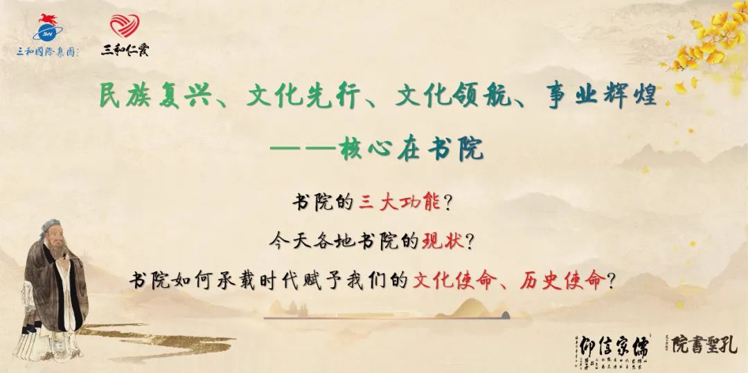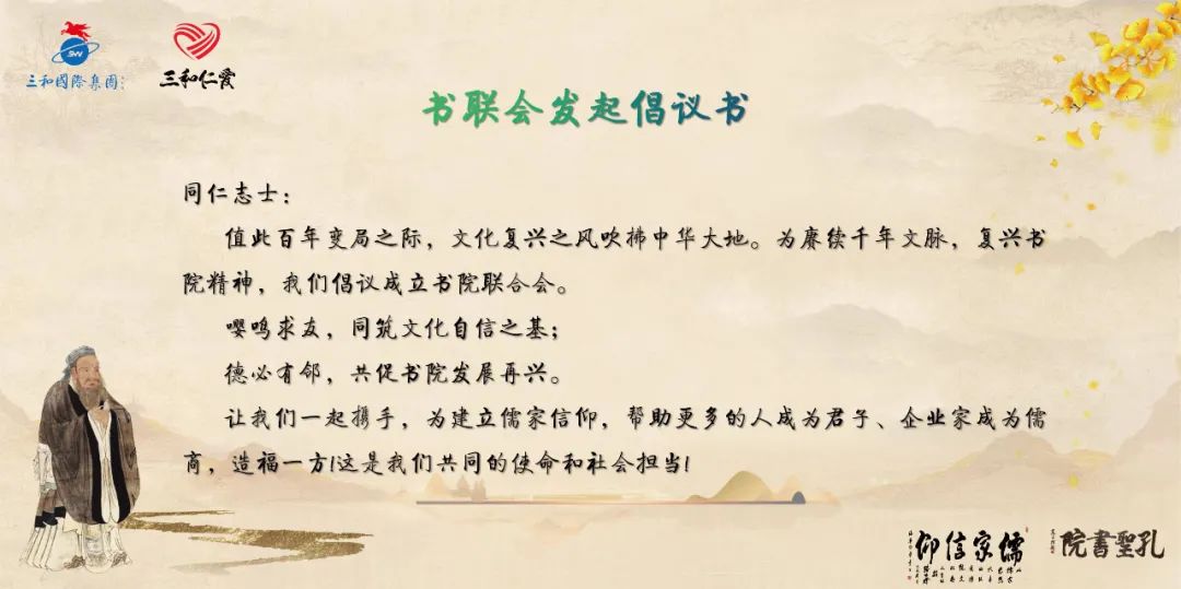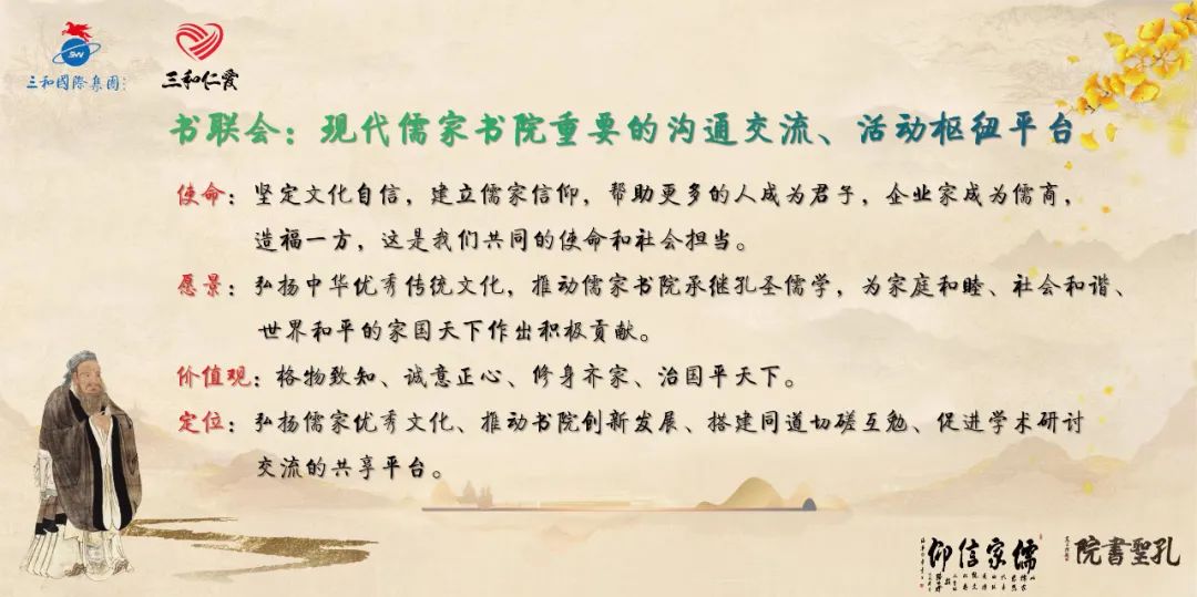 民族复兴、文化先行、文化领航、事业辉煌,而书院正是其核心所在。传统书院与现代书院共同承载着深厚的文化底蕴,而如何在继承传统的基础上实现修身为本,正是我们当前面临的挑战。当前,各地书院虽然各具特色,但普遍缺乏互动与交流,这限制了书院在文化传承与发展中的作用。因此,我们需要成立一个现代儒家书院重要的沟通交流、活动枢纽平台——书院联合会。其使命是坚定文化自信,建立儒家信仰,帮助更多的人成为君子,企业家成为儒商,造福一方,这是我们共同的使命和社会担当。愿景是弘扬中华优秀传统文化,推动儒家书院承继孔圣儒学,为家庭和睦、社会和谐、世界和平的家国天下作出积极贡献。定位是弘扬儒家优秀文化、推动书院创新发展、搭建同道切磋互勉、促进学术研讨交流的共享平台。