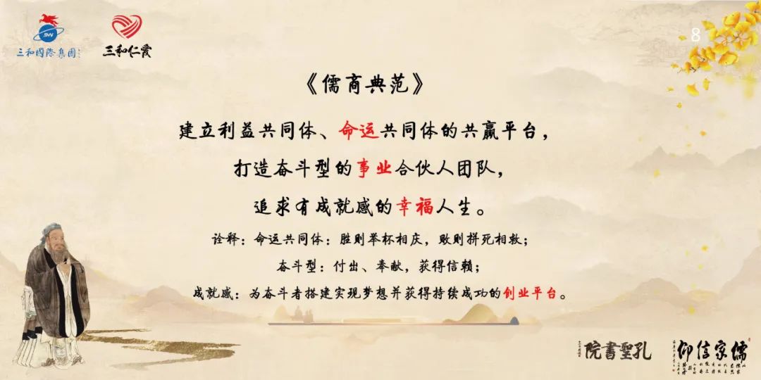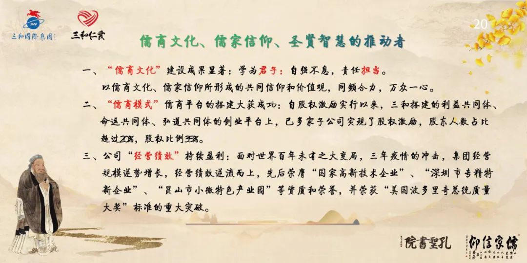 三和国际通过成立商学院与孔圣书院,通过礼乐教化让全体员工成为君子,自强不息,责任担当;举行告拜礼与祭孔大典,建立信仰;每周大晨会强调修身五要素,每季度管理层自我反省成长会,每年深圳孔子文化节的成功举办,学为君子,天下归仁。同时,设立家族事业委员会,它是“先锋组织、核心力量”。符合中国国情的机制设计与股权激励制度,建立利益共同体、命运共同体的内部创业平台。儒家百年老店孔圣堂回归大陆,孔圣堂儒家智慧大讲堂、儒学孔圣修身营、儒商基业长青社等活动蓬勃开展,彰显了儒商文化的深远影响与现实价值。
