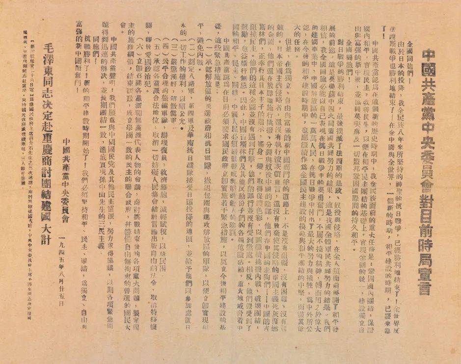 1945年8月25日,中共中央发表《对目前时局宣言》,明确指出全民族面前的重大任务是:巩固国内团结,保证国内和平,实现民主,改善民生,以便在和平民主团结的基础上,实现全国的统一,建设独立自由与富强的新中国。