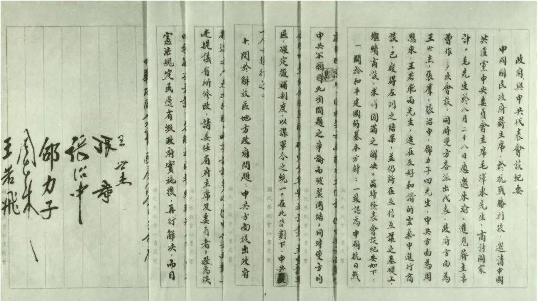 在《双十协定》中,中国共产党作出同意撤退南方八个解放区的部队、大幅缩编人民军队等重大的让步,但国民党当局执意要取消解放区的人民政权和人民军队,这两个问题无法达成协议,只得留待继续商谈。图为《双十协定》文本。