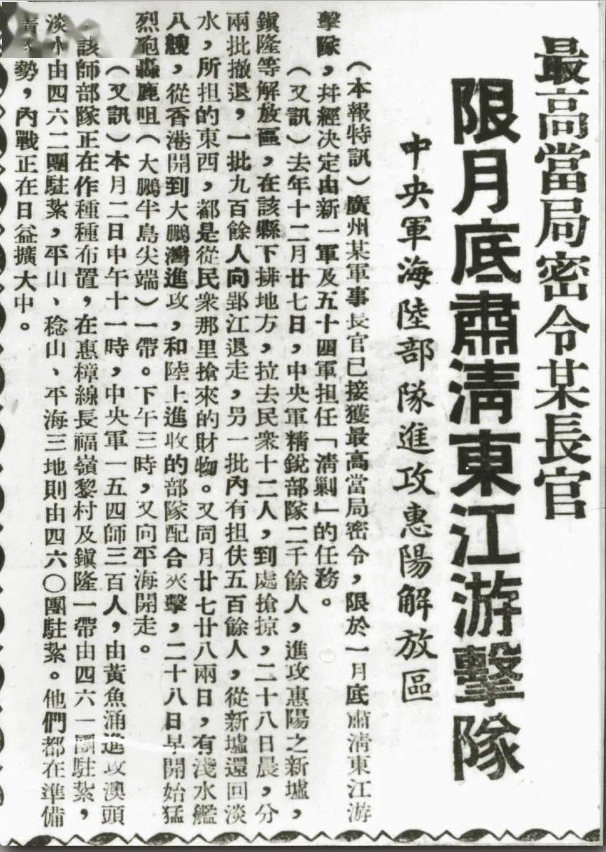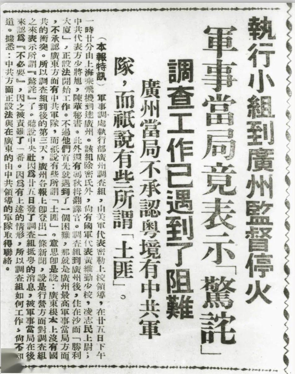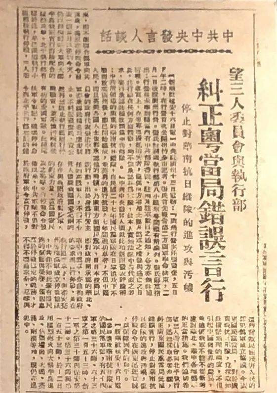 1946年2月17日,中共中央发言人希望三人委员会与北平军事调处执行部纠正广东国民党当局的错误言行,停止对华南抗日纵队的进攻和污蔑,使停战命令在广东迅速实现。图为《解放日报》的报道。