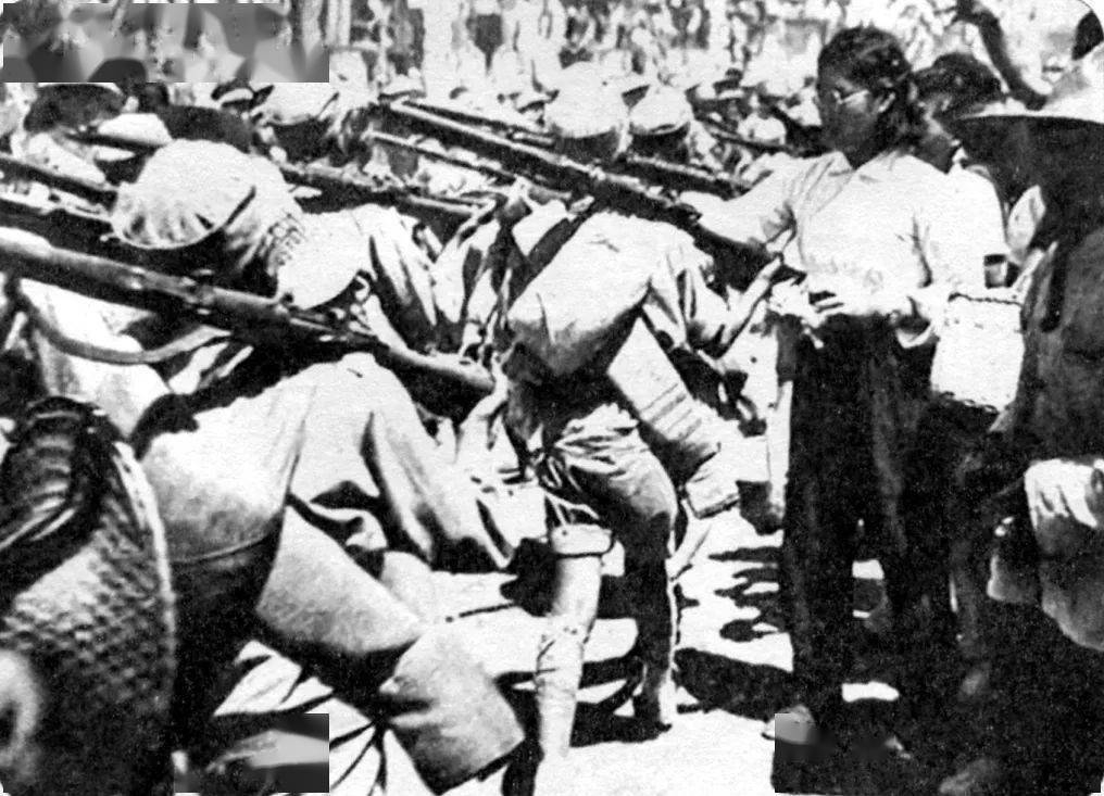 烟台群众给北撤战士塞鸡蛋、红枣等食物。