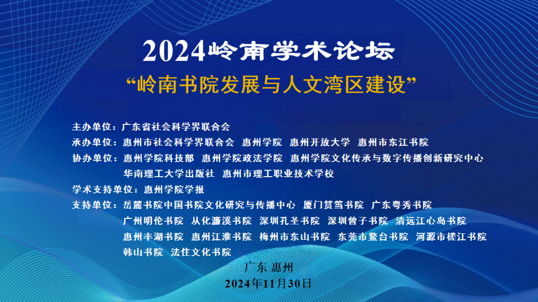 本场论坛由广东省社会科学界联合会主办,惠州市社会科学界联合会、惠州学院、惠州开放大学、惠州市东江书院承办。活动得到岳麓书院中国书院研究中心、华南理工大学出版社、惠州学院科技部及政法学院、厦门筼筜书院、深圳孔圣书院等单位的支持。来自全国各地高校和研究院所专家学者、15家书院经营管理团队共150多人参加论坛,就推动岭南书院文化保护、传承和创新发展展开深入交流探讨,积极为岭南书院发展与人文湾区建设建言献策。