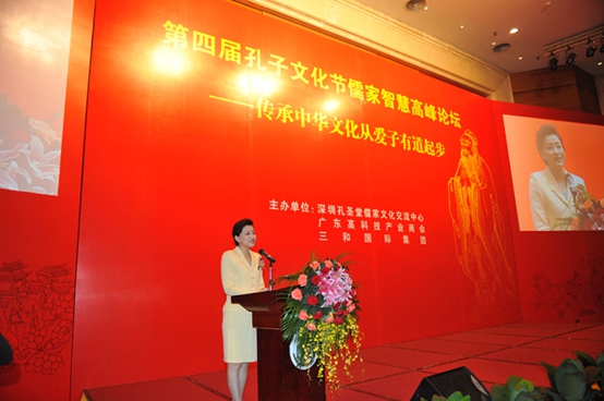 20日下午,在深圳五洲宾馆举行了文化节的另一重要活动“儒家智慧高峰论坛”,此次高峰论坛围绕“传承中华文化从爱子有道起步”的主题展开,论坛由知名媒体人杨澜主持。深圳市政协主席王穗明出席了论坛活动,深圳市委宣传部常务副部长吴忠出席论坛并发表讲话。