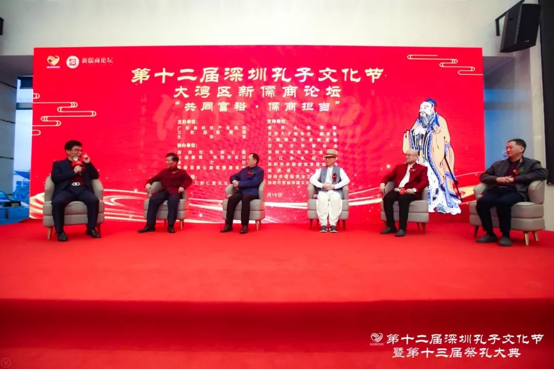 左起:至圣孔子基金会执行长陈泰旭;广东省政协常委、广东高科技产业商会会长、深企联常务会长王理宗;深圳孔子文化节创始人;新儒商事业、家风建设推动者、三和国际集团董事长张华;市委宣传部二级巡视员、曾任市委外宣办主任、市政府新闻办主任,著名儒家学者韩望喜;原深圳市委统战部副部长、深圳市侨联主席、市侨媛协会会长、孔子后裔孔爱玲;当代著名儒学家、新儒商事业创立者、中山大学哲学系原系主任黎红雷。