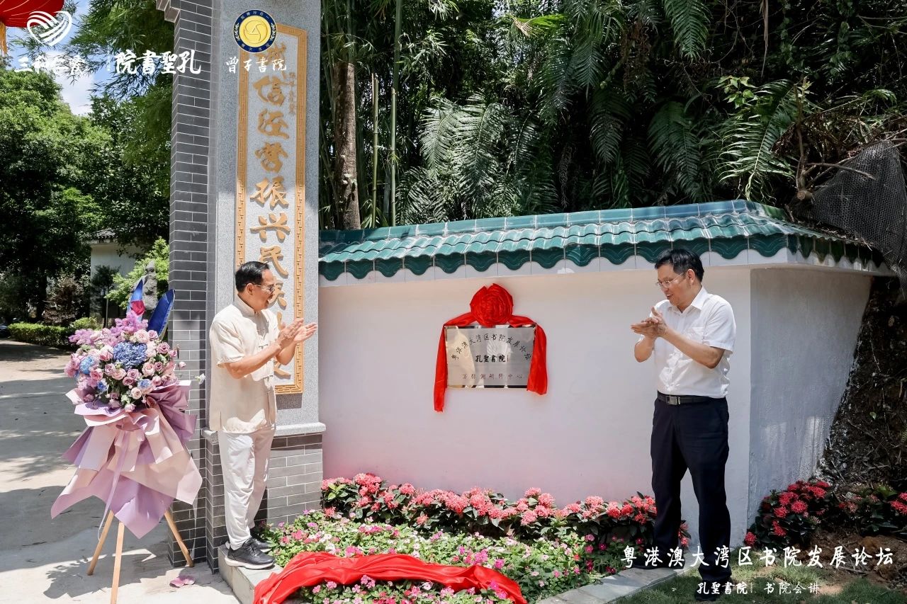 赠书仪式后,粤港澳大湾区书院发展论坛主办方孔圣书院院长张华携手东源县委常委、宣传部部长张松新,共同为“粤港澳大湾区书院发展论坛孔圣书院万绿湖研修中心”牌匾揭幕。