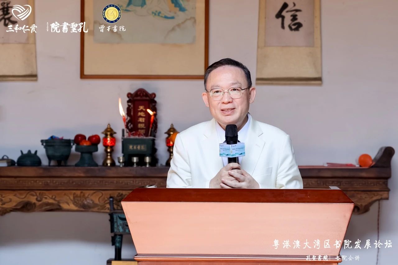 活动伊始,三和国际集团董事长、粤港澳大湾区书院发展论坛会长、三和仁爱文化基金会会长张华代表主办方对各位嘉宾的到来表示了热烈的欢迎和衷心的感谢。在当前百年未有之大变局的背景下,个人、家庭、企业乃至整个社会都面临着严峻的考验和挑战。因此,弘扬儒家文化显得尤为重要。深圳孔子文化节已经持续举办了十五届,其宣传造势和影响力已经名声在外,持续地传承、弘扬和发展儒家思想、儒家文化,并取得了阶段性的成果。粤港澳大湾区书院发展论坛的使命是坚定文化自信,建立儒家信仰,帮助更多的人成为君子,企业家成为儒商,造福一方。愿景是弘扬中华优秀传统文化,推动儒家书院继承孔圣儒学,为家庭和睦、社会和谐、世界和平的家国天下作出积极贡献。论坛的价值观秉承“格物致知、诚意正心、修身齐家、治国平天下”的理念,为推动书院新质生产力发展、搭建同道切磋交流、培养儒学未来人才、推动并实现中华民族文化复兴的共享平台。